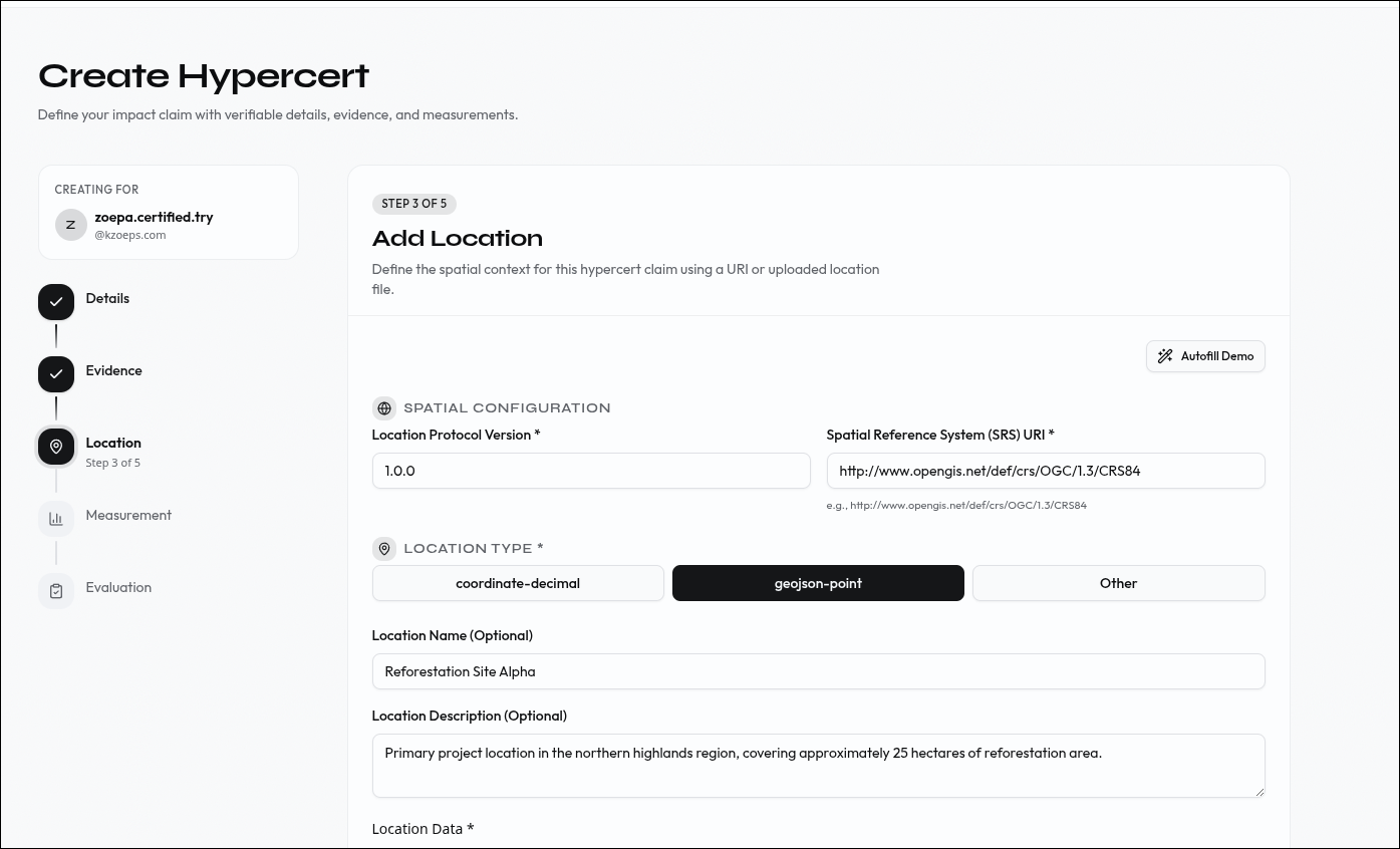 Optionally anchor the work geographically. This creates an app.certified.location record referenced from your hypercert.