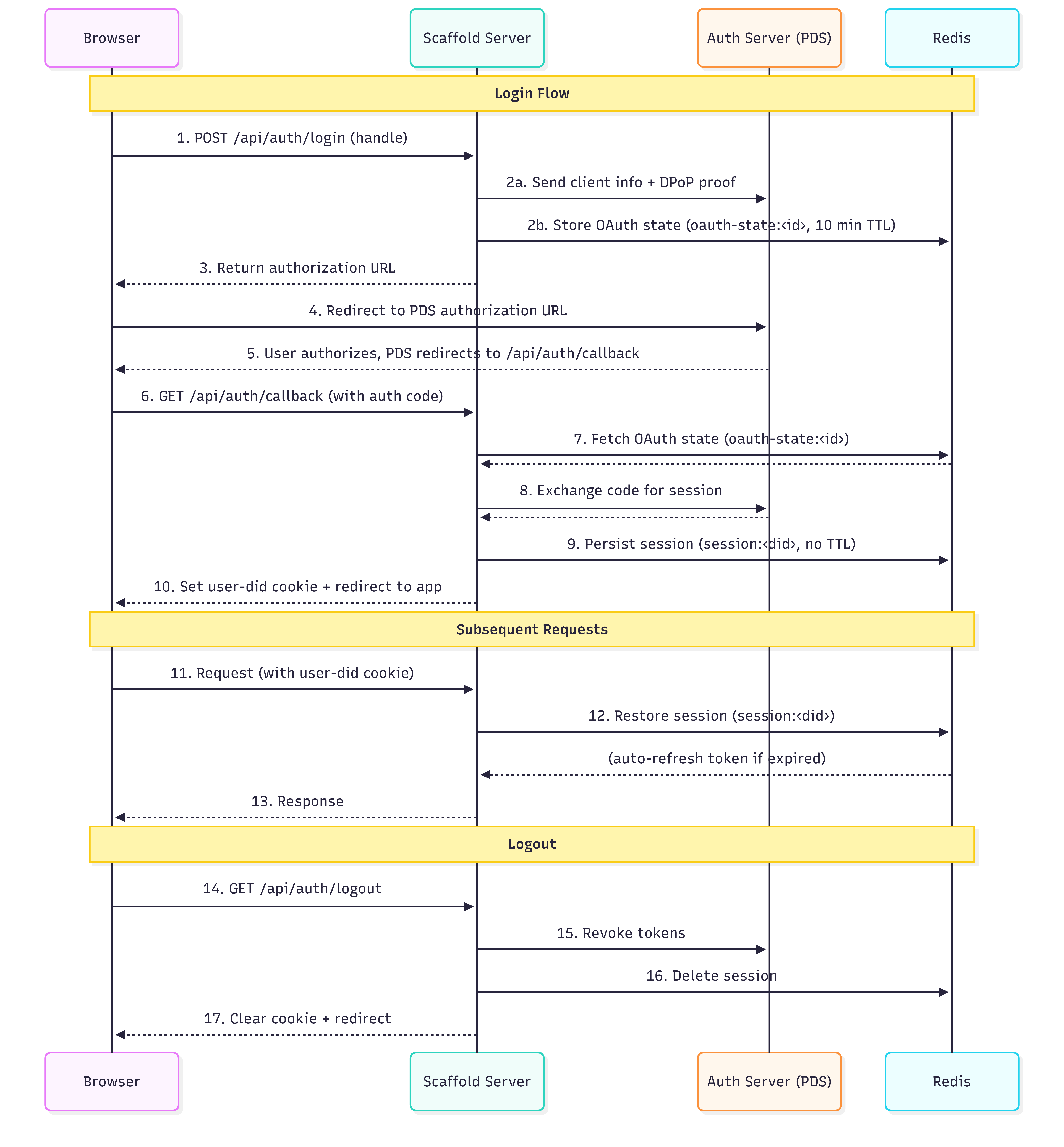 The scaffold implements ATProto OAuth with DPoP-bound tokens. The flow involves four parties: the Browser, the Scaffold Server (Next.js), the Authorization Server (user's PDS), and Redis (session storage).