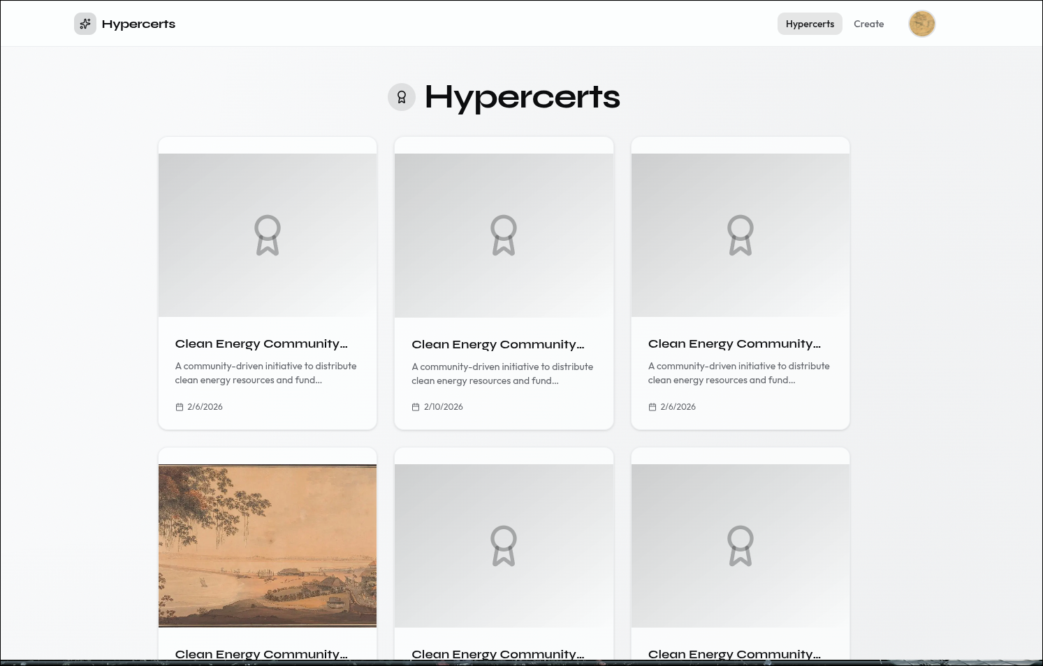 The hypercerts page shows all your claims in a card grid. Each card displays the title, description, creation date, work scope tags, and cover image. Click any card to view its full details.